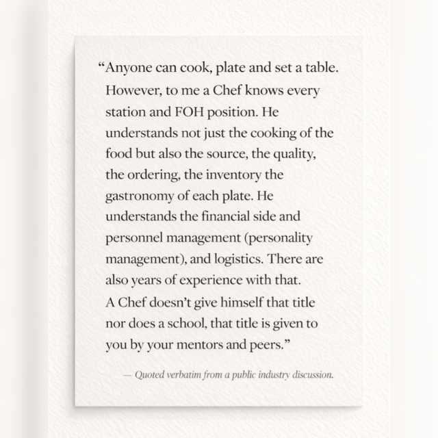 Lately, I’ve seen a familiar argument make the rounds again: that unless you came up through traditional restaurant kitchens, worked every station, logged the hours, went to culinary school, and earned the approval of mentors and peers, you shouldn’t call yourself a chef. At best, you’re a cook. Maybe a caterer. Definitely not a chef.
